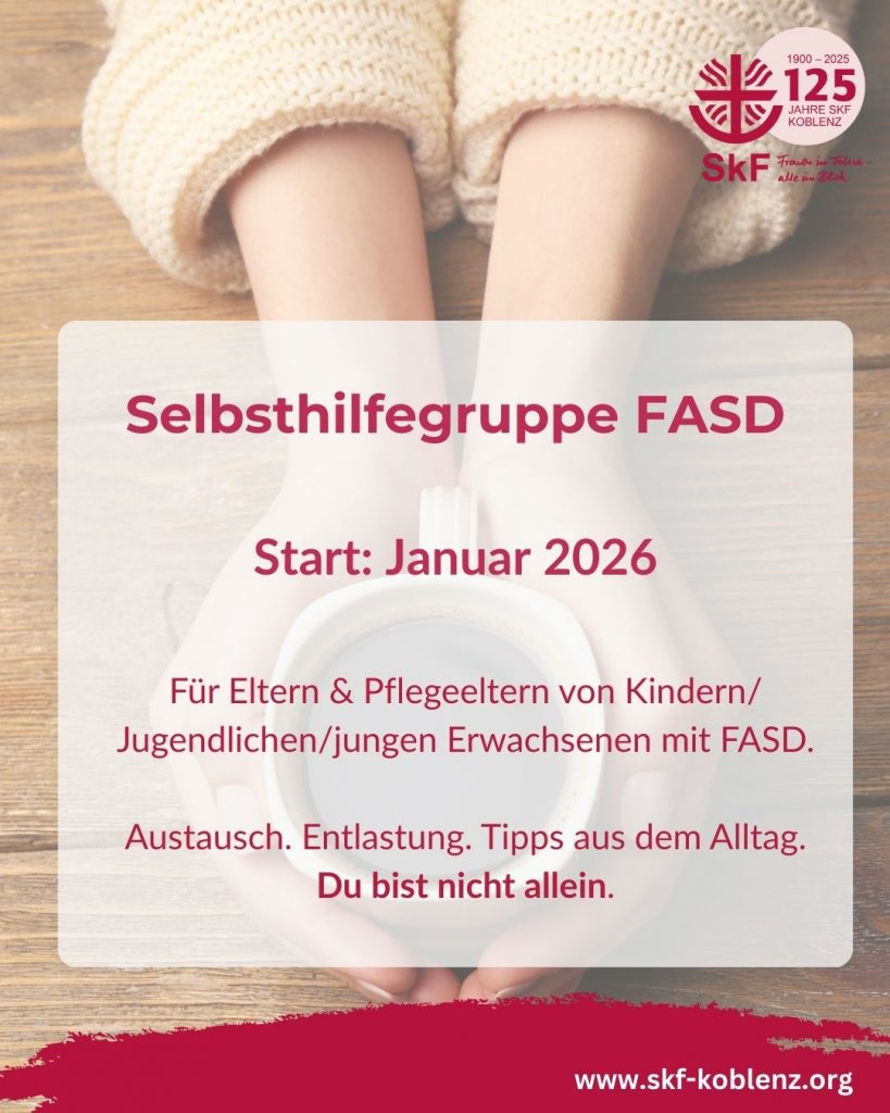 Der Alltag mit einem Kind oder Jugendlichen mit FASD kann sich anfühlen wie Dauer-Feuerwehr: viel Liebe – und gleichzeitig ständige Herausforderungen, viele offene Fragen und oft auch Unverständnis von außen. Damit Sie damit nicht alleine bleiben, startet beim SkF Koblenz ab Januar 2026 eine Selbsthilfegruppe für Eltern und Pflegeeltern von Kindern, Jugendlichen und jungen Erwachsenen mit FASD (Fetale Alkoholspektrumstörung).